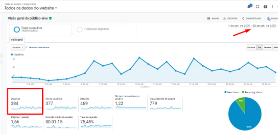Outra imagem mostra o tráfego orgânico desde o início do projeto até setembro de 2021, representando apenas um mês de projeto.
