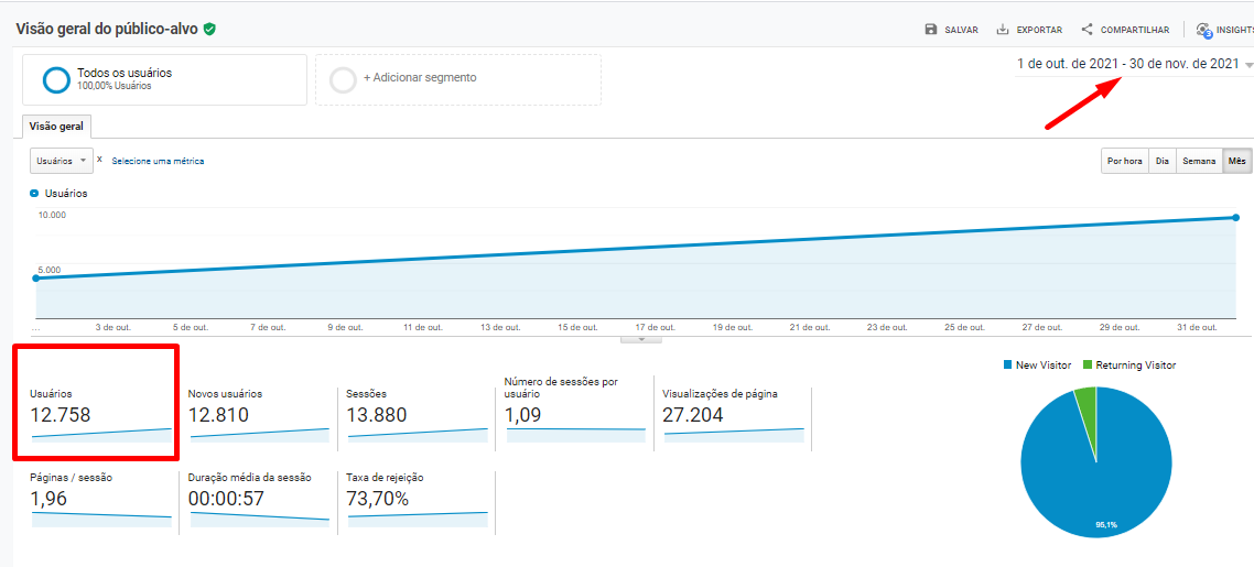 Na próxima imagem, podemos destacar o tráfego orgânico do site da loja online de brinquedos no mês de novembro de 2021. Foram registrados 9.084 acessos orgânicos nesse mês, representando um crescimento de 200% desde o início do projeto de SEO (apenas um mês de projeto).