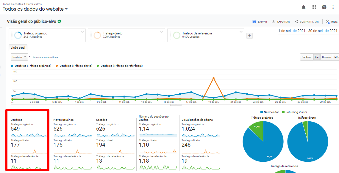 Na outra imagem, podemos destacar o tráfego orgânico do site da vidraçaria no mês de setembro de 2021. Foram contabilizados 737 acessos orgânicos ao site nesse mês, representando um crescimento expressivo desde o início do projeto de SEO.