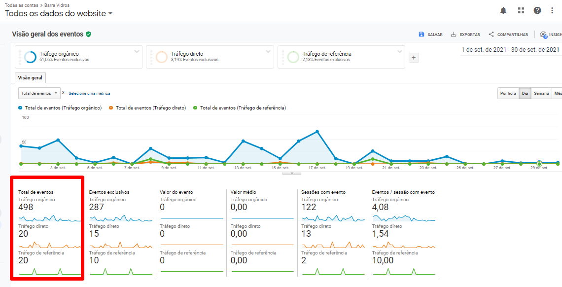 Na imagem acima, exibimos os eventos realizados no site durante o mês de setembro de 2021. Esses eventos rastreáveis incluem interações por meio do WhatsApp, preenchimento de formulários de contato, leadster e outras ações. Além disso, muitos contatos são realizados por telefone diretamente com a empresa.