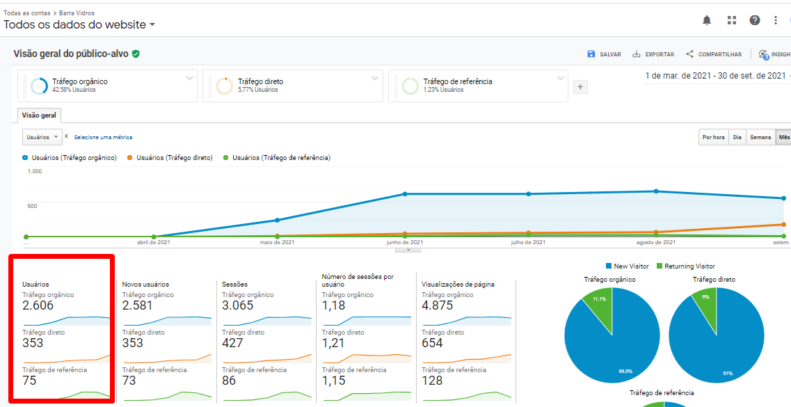 Na outra imagem, apresentamos o tráfego orgânico desde o início do projeto até setembro de 2021, revelando números impressionantes.