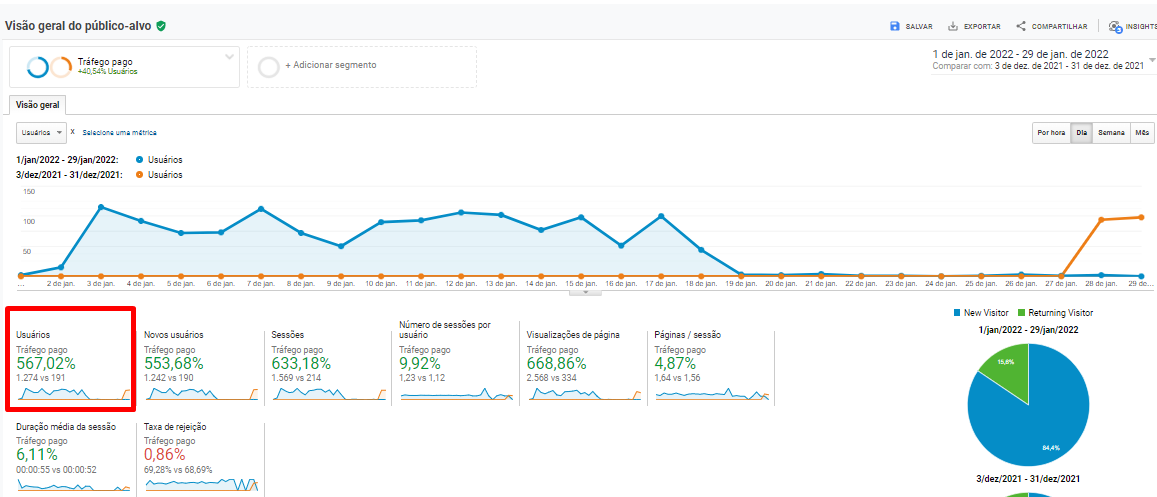 Aqui podemos verificar os eventos realizados no site através do Google Ads no mês de janeiro em comparação com dezembro. Crescimento de 868,42% em contatos com a empresa. Esses eventos rastreáveis foram feitos pelo ícone do WhatsApp e formulário de contato do site. Além desses, diversos contatos são feitos através do telefone da empresa.