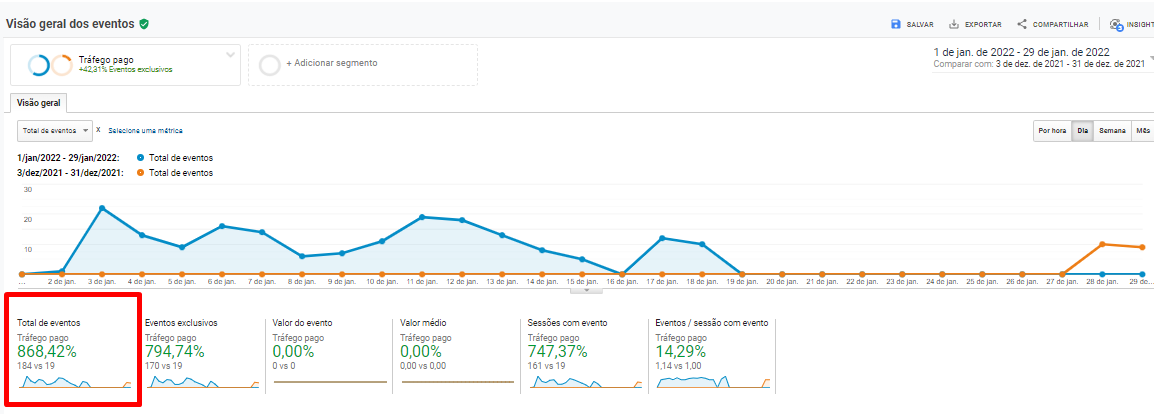 Imagem: Demonstração dos eventos de tráfego pago, realizados no mês de dezembro de 2021 no site.